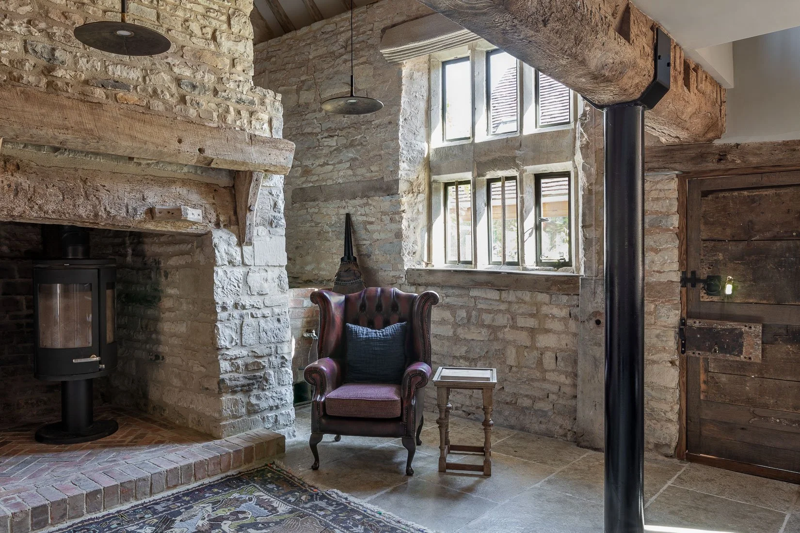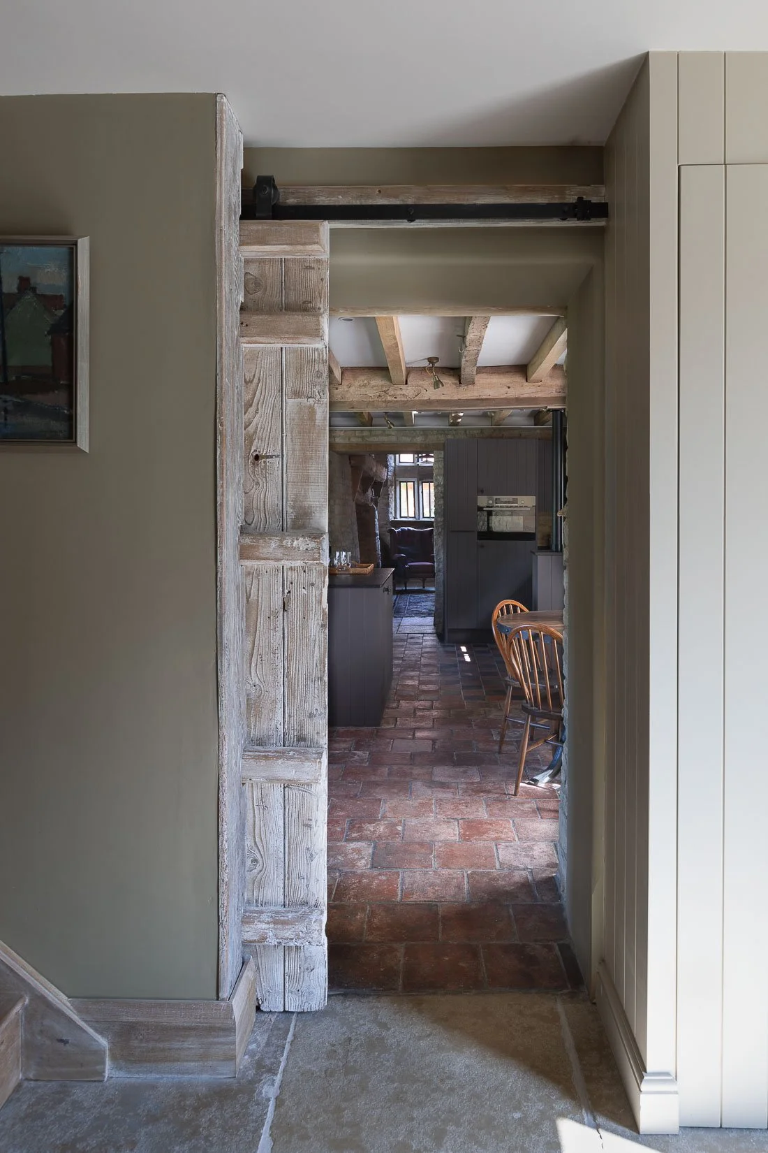 When adding new elements to the building, careful attention was given to referencing the type of material that would have originally been used. Craftsmanship and detail were very important here. Ancient doors, that had been stored in the barn for years, were re-used and, after long hunts for old elm boards, reclaimed floorboards were also added to fit gaps where originals had disintegrated.