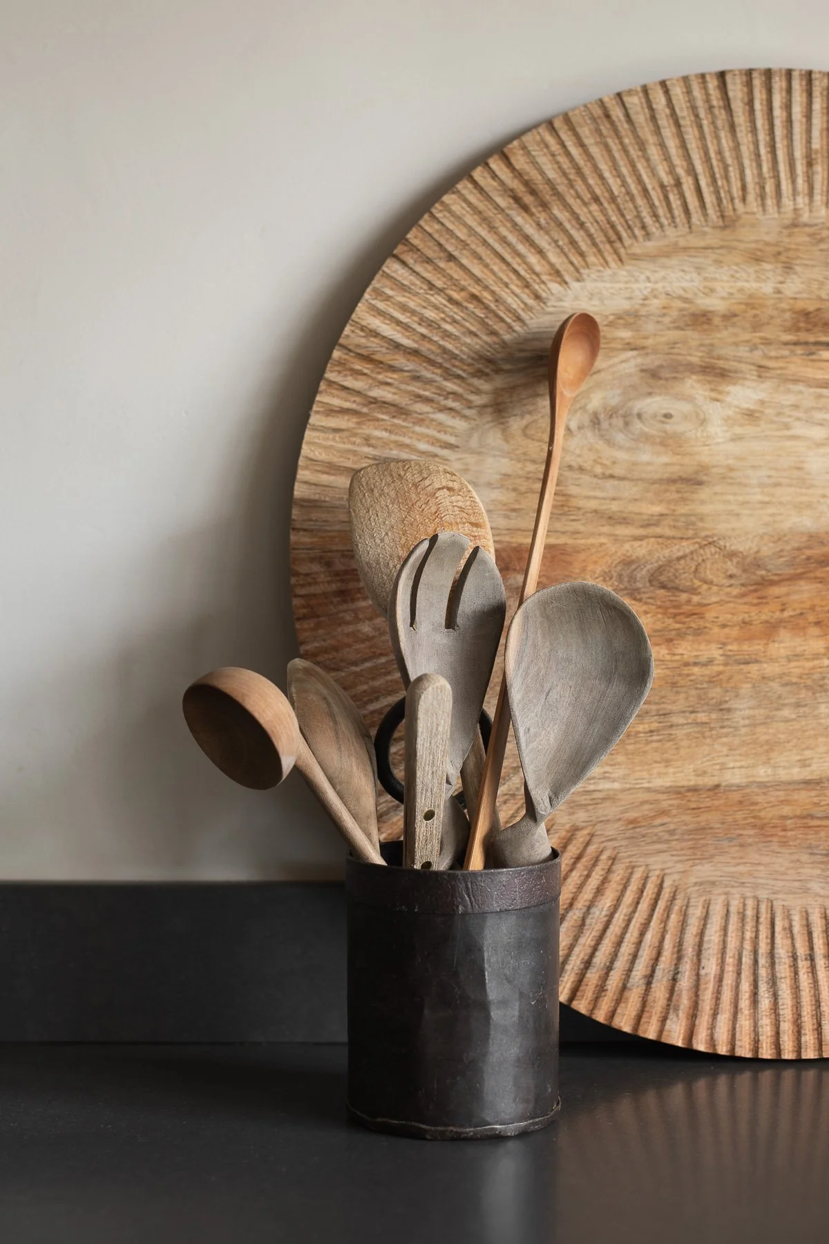 The kitchen, the first of our signature tongue and groove SAAL kitchens to be installed, was designed to be simple and functional. The single run of worktop and units along one wall, and tall units along another, allows for the kitchen table to be central to the room and for the space to flow when full with guests. Having the open natural wood shelves for the clients collection of ceramics and plants added to the atmosphere of the space, while remaining practical. However, my favourite feature in this kitchen has to be the large, metal casement doors. Along with the neutral, natural palette and floor tiles that continue outside, they invite the oasis of a back garden in and give a much-needed illusion of space.
