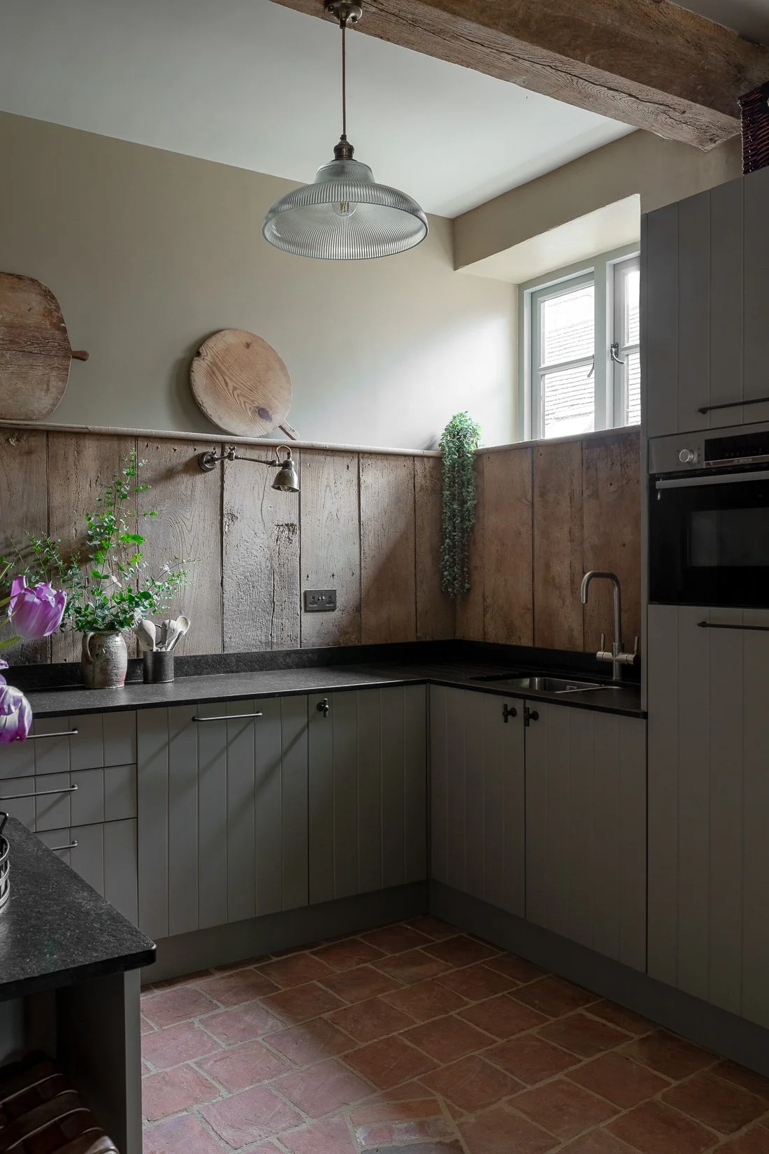 Lighting and a lack of windows were the main challenge in this conversion. Fortunately, planning allowed the installation of a pair of glazed double doors, opening onto a courtyard garden, that brings natural light into the kitchen and transforms the space into somewhere a lot more inviting for humans!